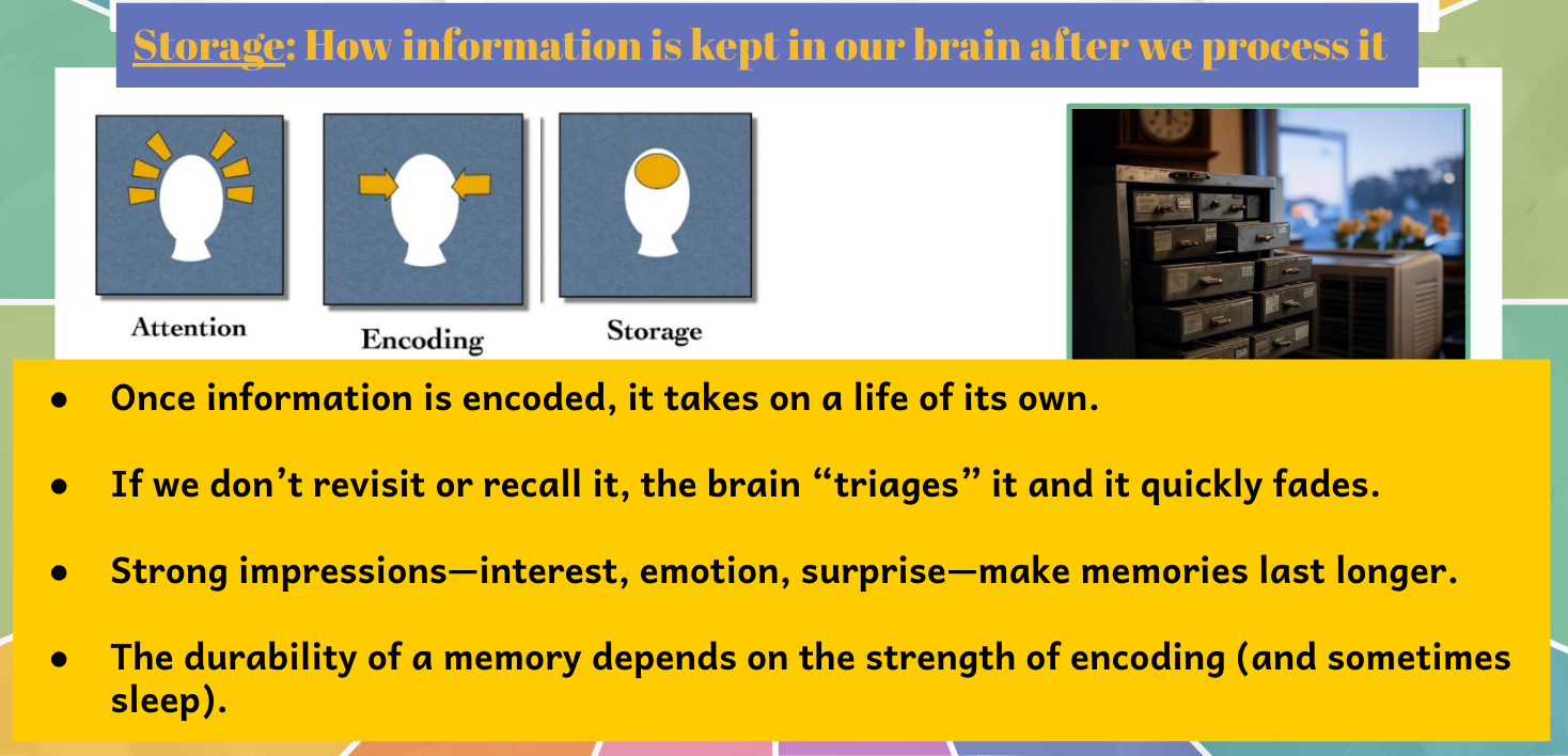 Storage is how the brain keeps information after it’s been encoded. Once students notice and understand something new, their brains decide what to hold onto and what to let fade. Without revisiting the information, much of it can be forgotten quickly.