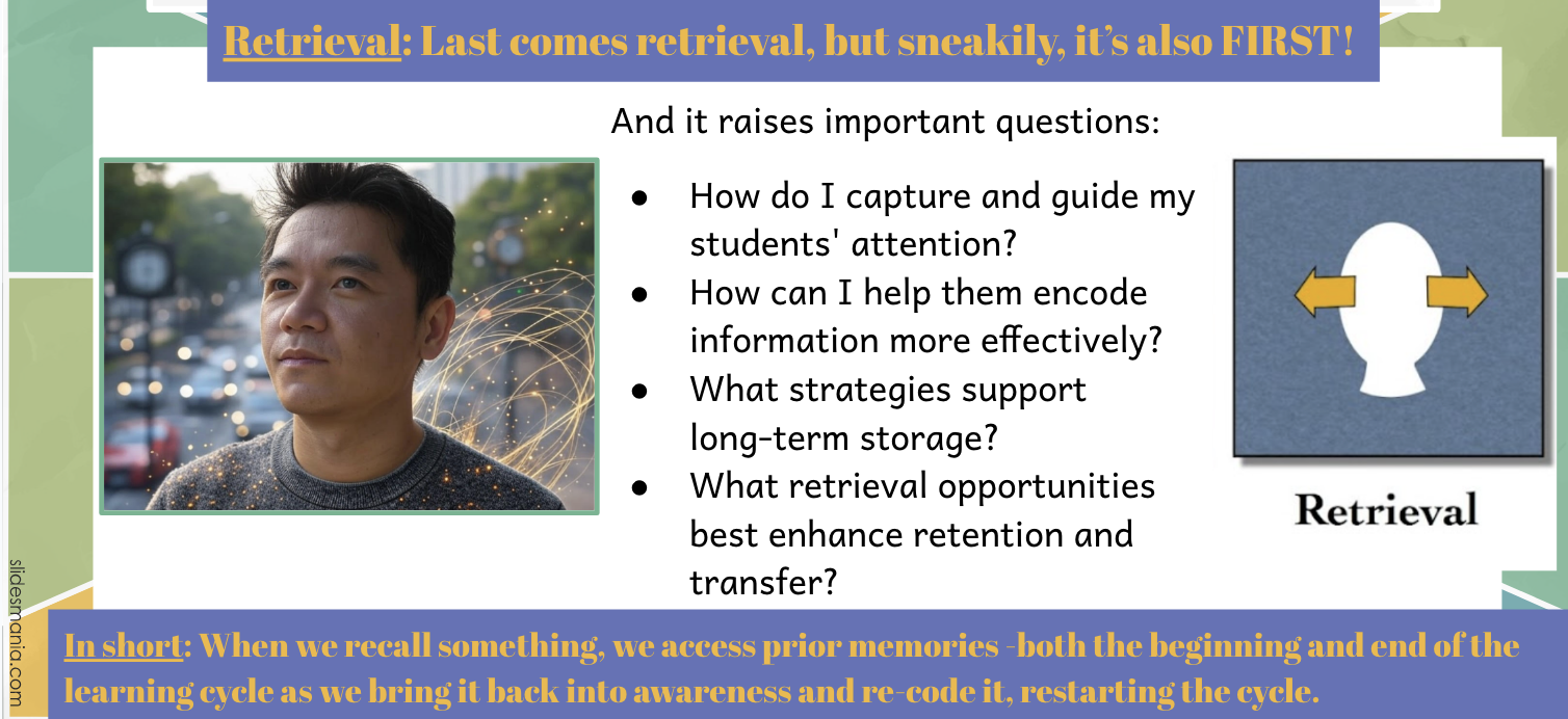 Retrieval connects all the other processes of learning of attention, encoding, and storage into a cycle. The more we help students pay attention, link new information to prior knowledge, store it effectively, and retrieve it regularly, the stronger and more flexible their language skills become!
